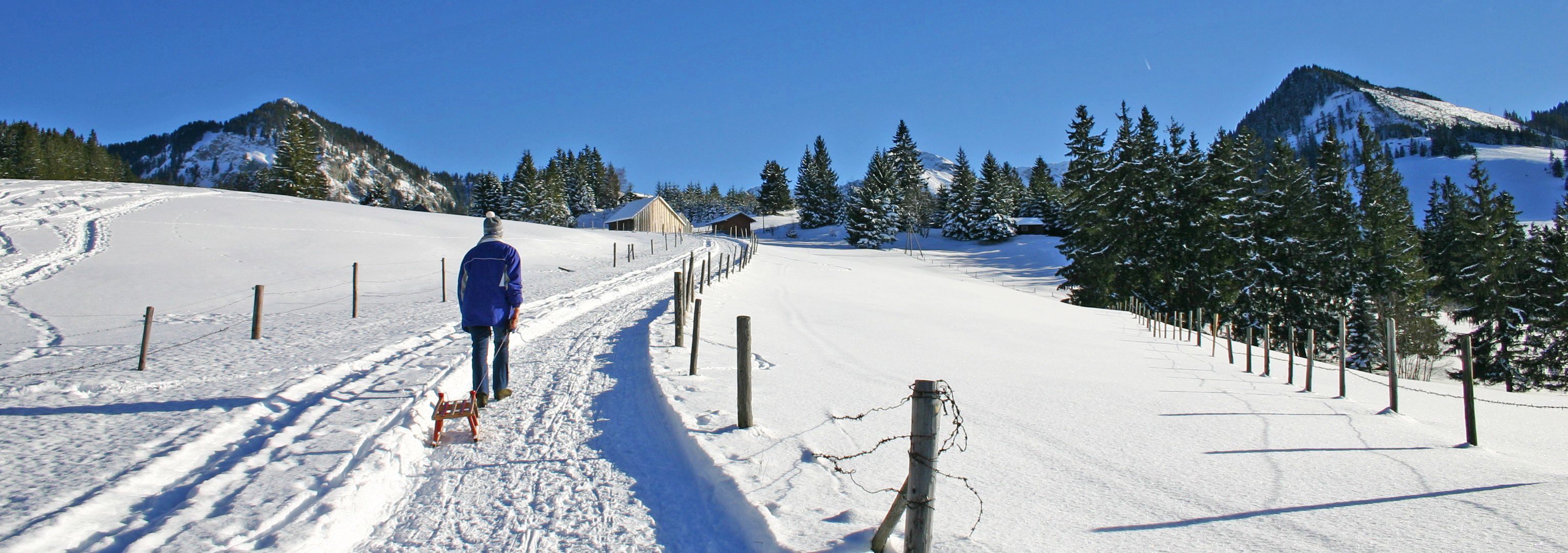 Ein Mann ist mit seinem Rodel auf dem schneebedeckten Winterwanderweg unterwegs zum Sonthofener Hof.